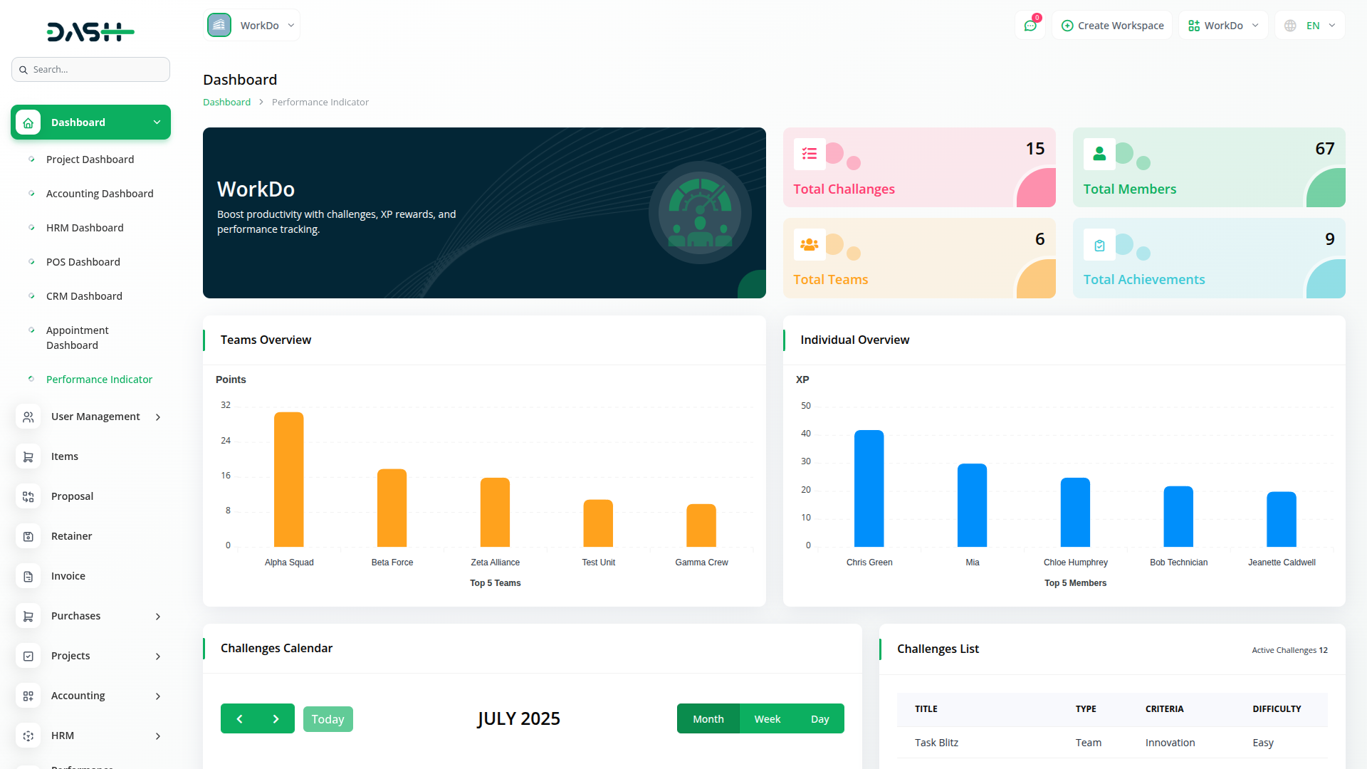 O Add-on do Indicador de Desempenho transforma o Dash SaaS em um mecanismo de gamificação, oferecendo progressão baseada em XP, rastreamento de desafios e gerenciamento de recompensas para aumentar o desempenho, a motivação e a transparência da equipe e do indivíduo.