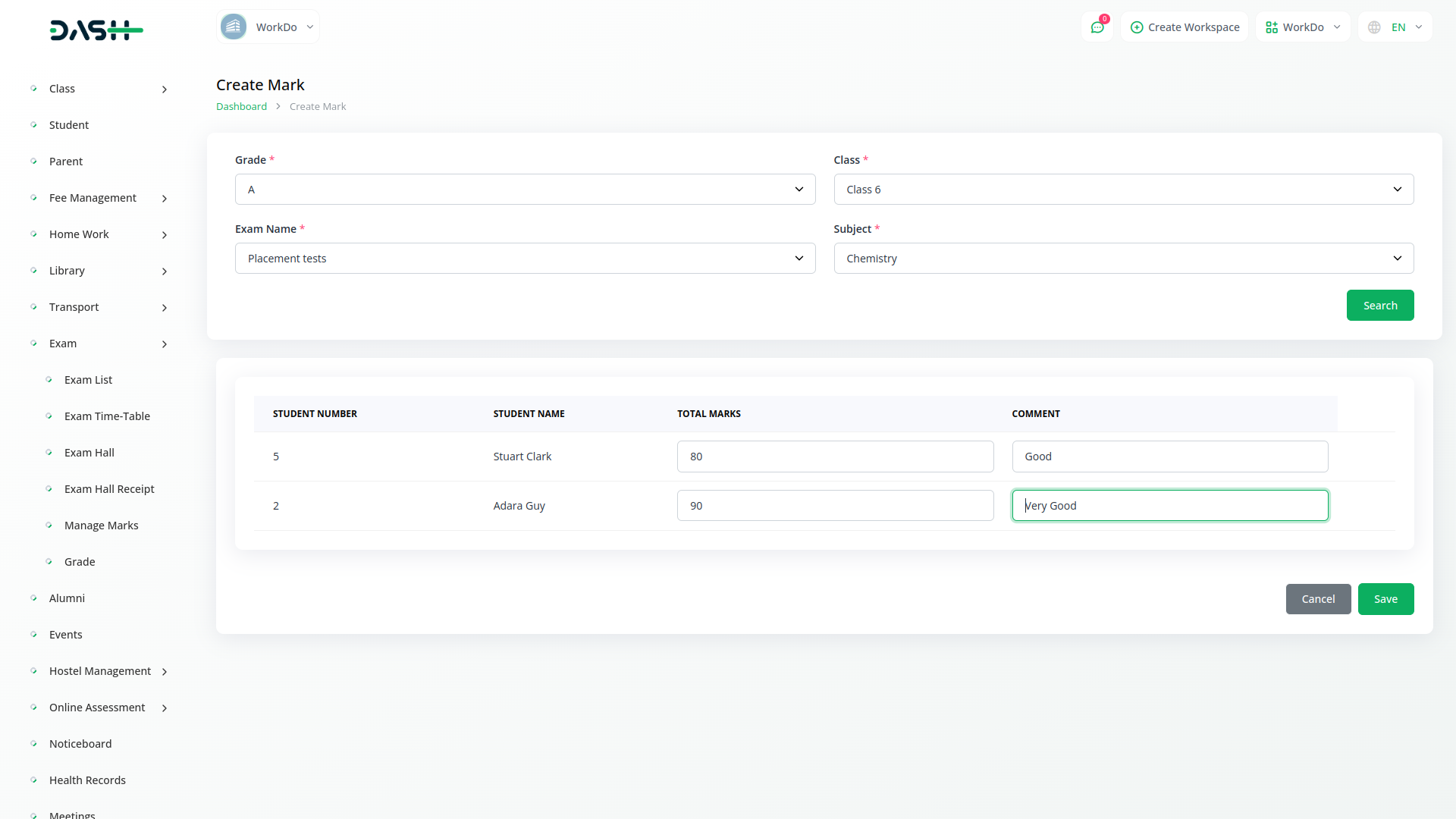 Dash SaaS`s Exam Module offers a centralized database for managing student marks and grades, providing administrators with valuable insights into student performance. From recording marks for individual exams to tracking student progress over time, this module ensures accuracy and transparency in mark management. By leveraging data-driven insights, educators can identify trends, strengths, and areas for improvement, ultimately enhancing academic outcomes.